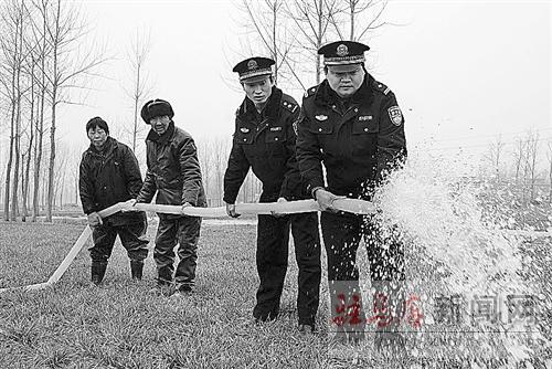 在當(dāng)前旱情十分嚴(yán)重的情況下,西平縣公安局組織民警把幫助困難群眾抗旱澆麥當(dāng)作開(kāi)門(mén)評(píng)警的首責(zé)。圖為當(dāng)?shù)嘏沙鏊拿窬趲椭罕姖驳?。通訊員 楊德清 攝