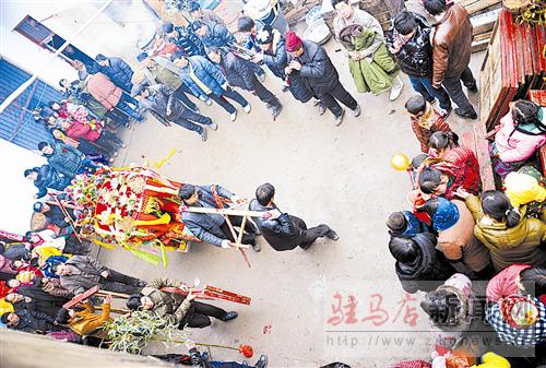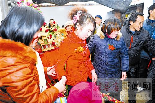 進(jìn)了新娘家,新娘的家人向“轎頭”遞上紅包,擺上白酒后,轎夫們將花轎擺成坐北朝南,只等新娘上轎。舉行一個(gè)簡單的儀式后,新娘在家人的攙扶下坐進(jìn)了花轎。
