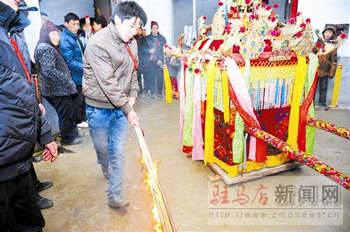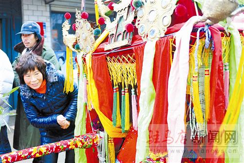 院子里,一頂鮮艷的花轎很惹眼,花轎頂端布滿各式的銅鏡和花翎,周身纏繞七色彩條。“轎頭”萬玉德告訴記者,這頂用椿木打造的花轎是他爺爺?shù)臓敔斪龅?,現(xiàn)在傳到了他的手中。“這頂花轎,娶回上千個(gè)新娘子了。”萬玉德自豪地說。