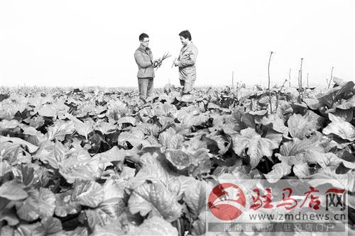 日前,在地處上蔡縣的河南宏茂農(nóng)業(yè)科技有限公司生態(tài)園內(nèi),技術(shù)人員正在查看紅苔菜的生長狀況。該生態(tài)園利用現(xiàn)代農(nóng)業(yè)科技進(jìn)行小麥良種繁育、特色瓜果蔬菜和花木種植,效益可觀。記者 張 朝 攝