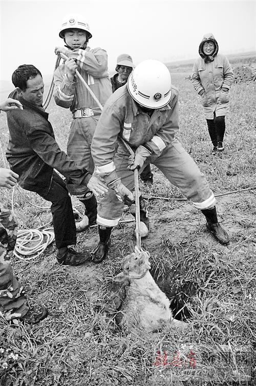 上午11時(shí)許,打好活結(jié)的消防救援繩索被順利套到牛犢的脖子上,消防官兵一邊用棍頂住活結(jié)處,一邊拉緊繩索,套牢牛犢的脖子。大家合力將小牛犢在幾秒鐘內(nèi)順利從機(jī)井里拉了出來(lái)(如圖)。被救出的牛犢在地上躺了一會(huì)兒后,很快便站起來(lái)跑到不遠(yuǎn)的牛群中。