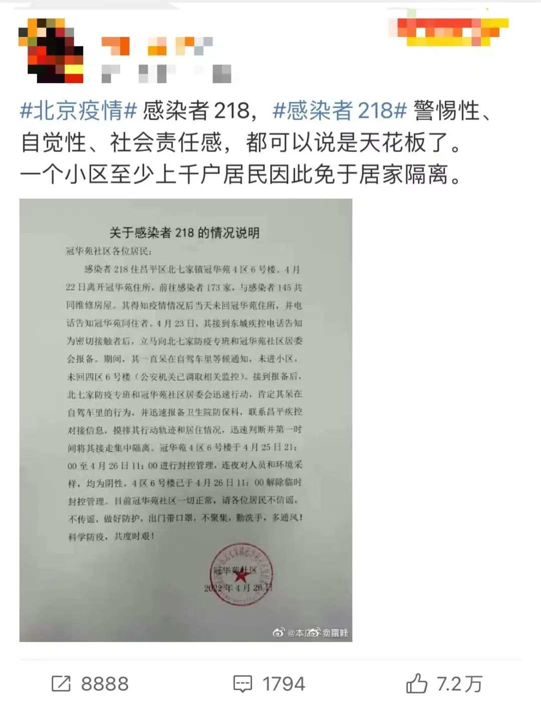 在北京正在經(jīng)歷的這一輪疫情中,一名感染者的做法感動了很多人。據(jù)北京晚報報道,居住在昌平區(qū)北七家冠華苑4區(qū)6號樓的感染者218,在接到疾控部門電話告知自己是密接后,立即向街道、社區(qū)報備,并留在自駕車內(nèi)等候通知,未進小區(qū)。這一行為幫助冠華苑社區(qū)第一時間排查疫情,連夜進行核酸檢測確保陰性后第一時間解封。整個過程只用了14個小時,目前該社區(qū)運行一切正常。