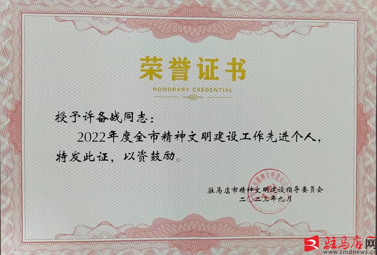 驛城區(qū)人民檢察院干警許備戰(zhàn)被評(píng)為2022年度全市精神文明建設(shè)工作先進(jìn)個(gè)人