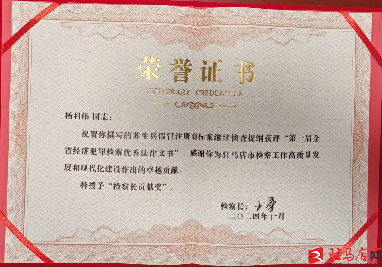 該院第二檢察部主任楊利偉撰寫的蘇生斌假冒注冊商標(biāo)案繼續(xù)偵查提綱獲評“第一屆全省經(jīng)濟(jì)犯罪檢察優(yōu)秀法律文書”,為駐馬店市檢察工作高質(zhì)量發(fā)展和現(xiàn)代化建設(shè)作出卓越貢獻(xiàn),被授予“檢察長貢獻(xiàn)獎”。