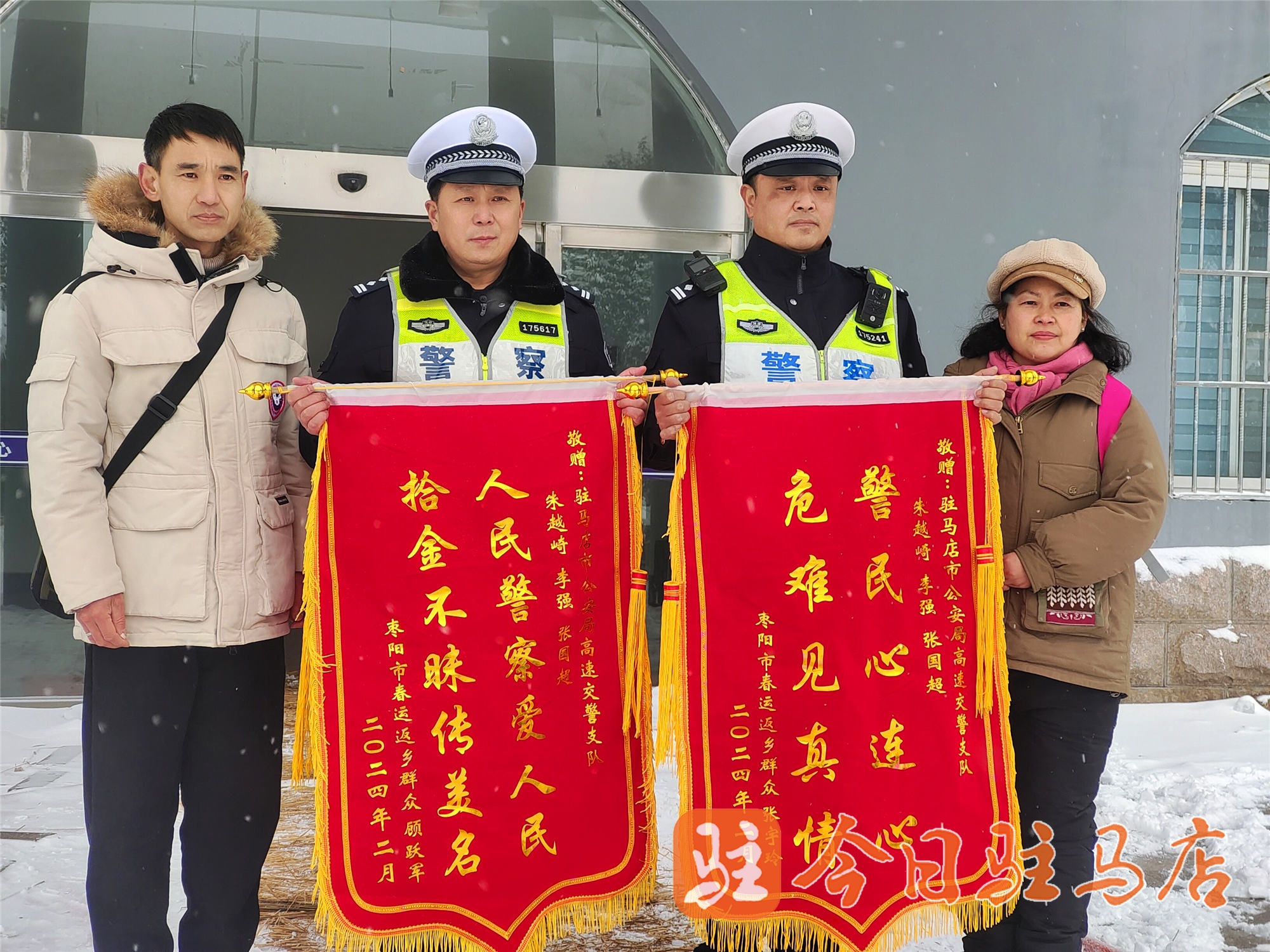 2月4日,他們從湖北棗陽來到了駐馬店市公安局高速交警支隊,取回了之前掉落的物品,并將提前精心制作的兩面錦旗交到值班民警手中:“民警同志,這可是我們的全部家當,價值240余萬元。要不是你們及時撿到,早就被過往的車輛碾得粉碎了!無法用語言表達我們的謝意!”