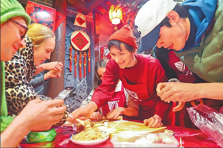 星光下的聚會熱鬧歡騰,人潮涌動,笑聲陣陣,每個人都在這里找到了屬于自己的節(jié)日記憶。雪景襯著漢服的身影,成為冬日里獨特的風景。而那些學著包餃子的外國面孔,則讓人看到中原文化的包容與魅力。古都的夜晚華燈璀璨,游人往來不絕,如同《上元燈彩圖》在眼前徐徐展開。畫卷里,丹楓色點染熱情、天青色暈開雪后美景、春辰色吐納萬物榮生、杏黃色照亮世間燈火。
