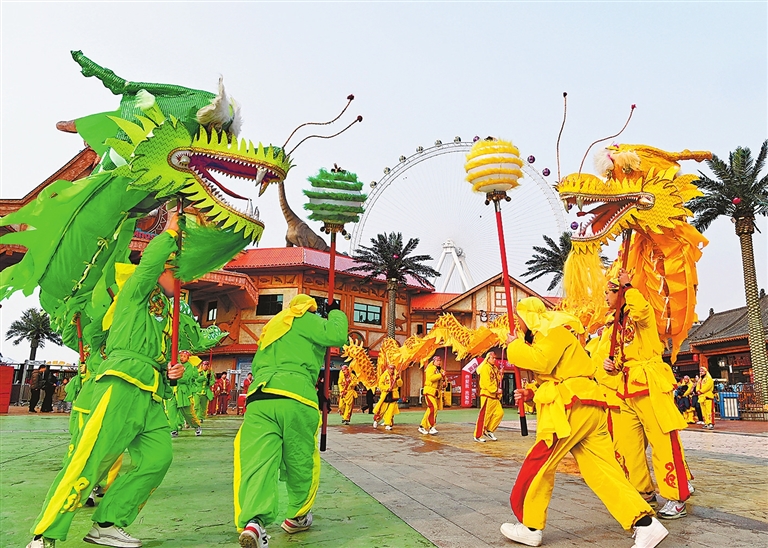 1月1日,一支民間舞龍隊在沁陽市懷府恐龍園游客廣場進行舞龍表演,迎新年,度元旦。 楊帆 攝
